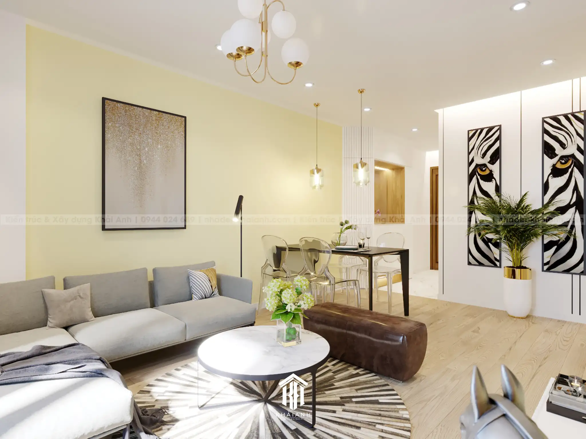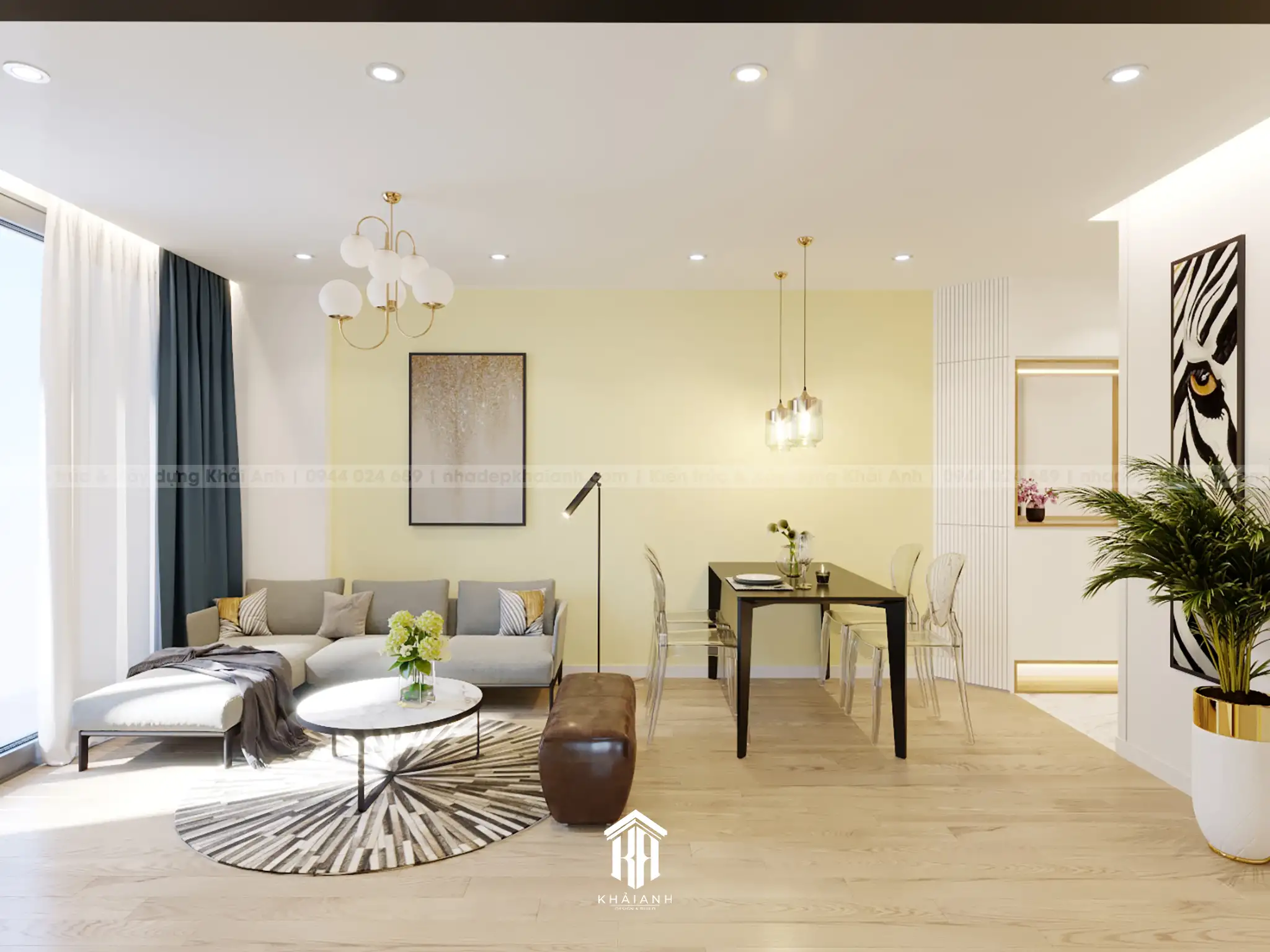 Sử dụng gam màu vàng nhạttrắng kết hợp gỗ sáng tạo không gian tươi mới, ấm áp. Nội thất tinh gọn, đường nét sạch sẽ. Điểm nhấn là các chi tiết Đương đại (ghế trong suốt, tranh đầu ngựa vằn) và ánh kim (gold/đồng) mang lại vẻ thanh lịchtrẻ trung.