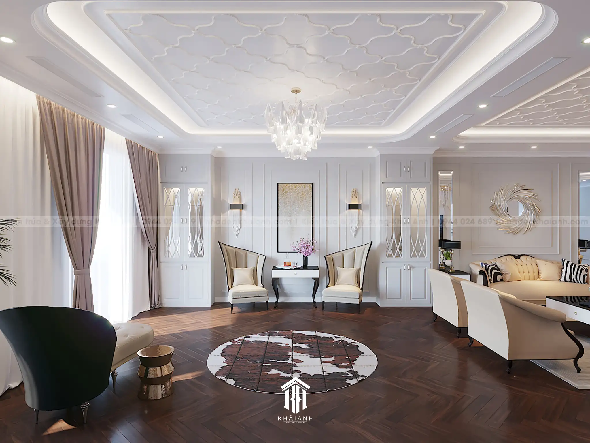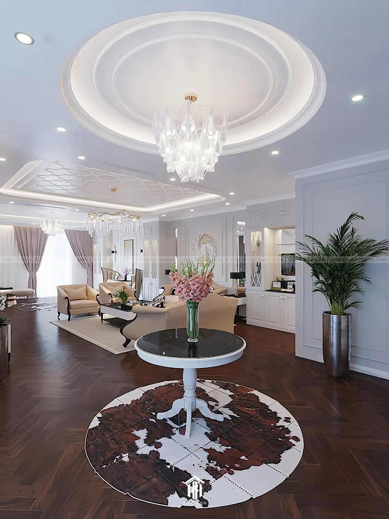 Nội thất được thiết kế theo phong cách Tân cổ điển sang trọng và tinh tế. Các chi tiết như trần nhà, đèn chùm và phào chỉ được thiết kế cầu kỳ, kết hợp với đồ nội thất có đường nét mềm mại, gam màu trung tính tạo nên không gian thanh lịch, hài hòa.