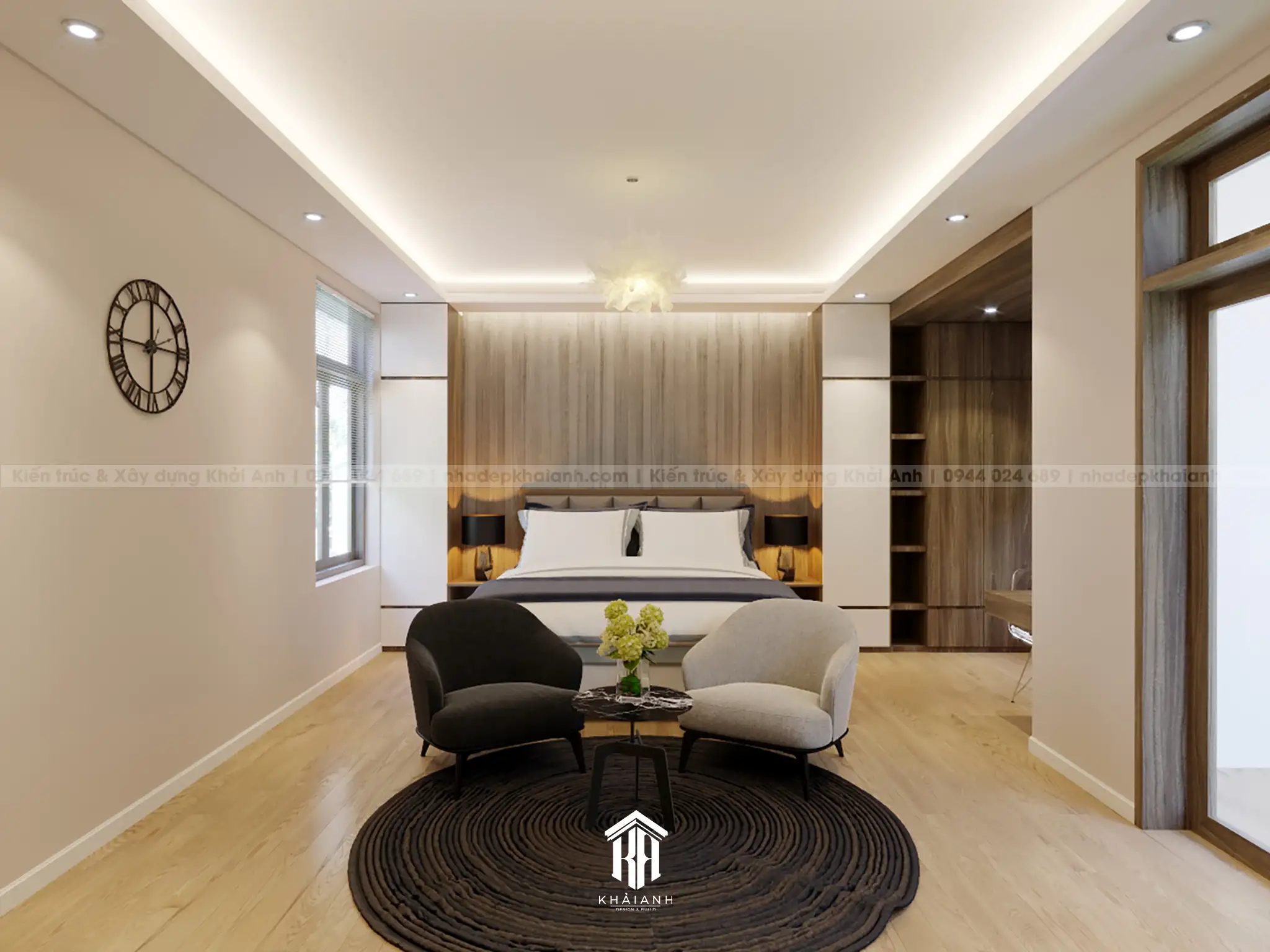- Nội thất phòng ngủ thiết kế hiện đại, sử dụng gam màu trung tính kết hợp gỗ sáng tạo cảm giác ấm áp và sang trọng.
